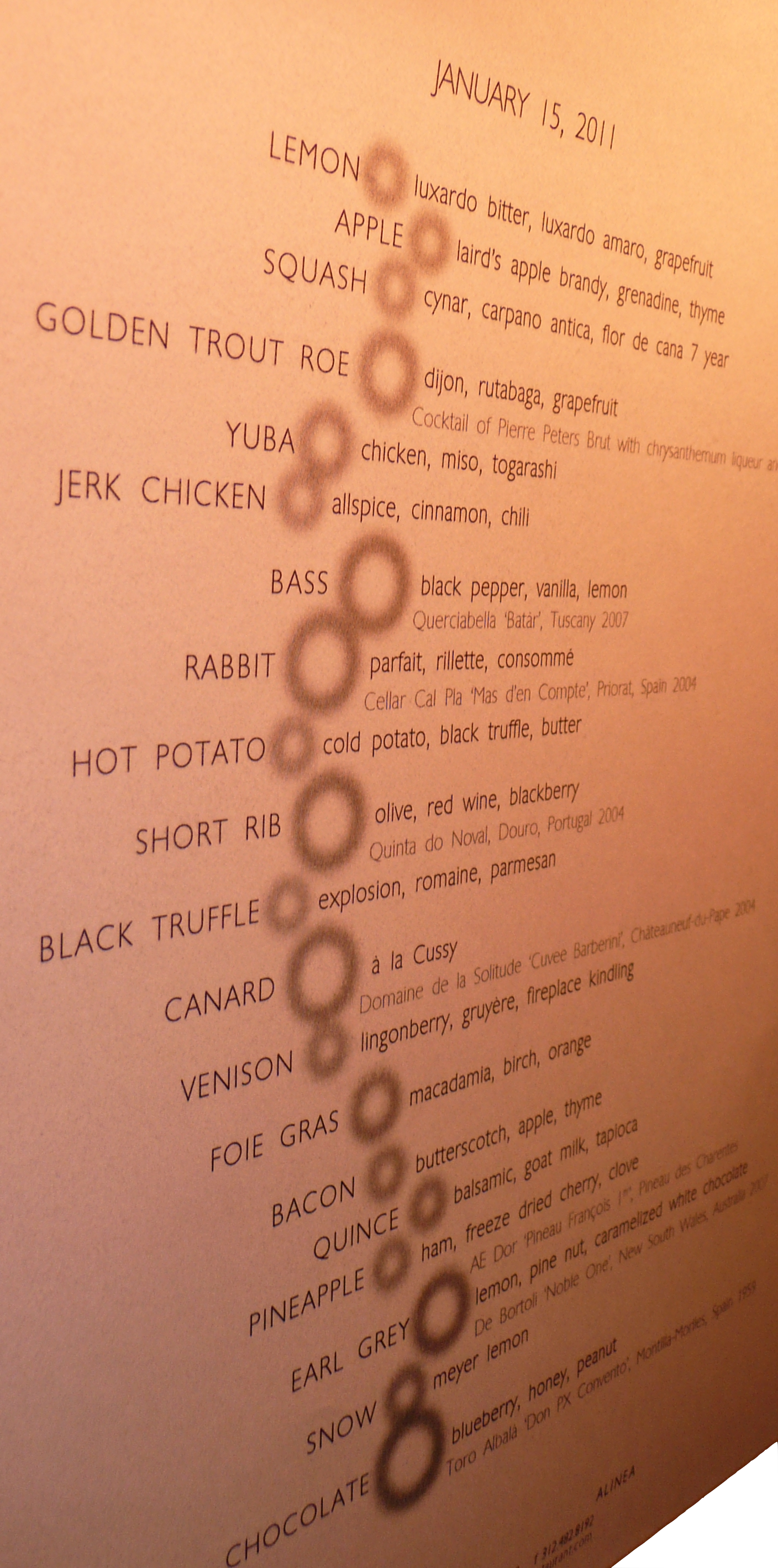 - How was the wine? The wine was great but this is probably where we were a little over our heads. We did their wine pairings were you get a little wine with every few courses. Erin and I are by no means oenophiles so I am sure many of the subtelties were missed by us. Nonetheless, the selections were very well chosen and paired perfectly with the courses. In particular, two wines that stood out were the 2004 Domaine de la Solitude Cuvee Barberini and the 1959 Toro Albala Don PX Convento.